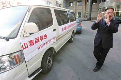 向央視春晚叫板,給全國(guó)人民拜年!弊蛱,朝陽(yáng)區(qū)華嚴(yán)北里8號(hào)院2號(hào)樓下,一輛寫有挑釁口號(hào)的面包車惹得市民駐足觀看。這輛“牛車”的車主老孟說,要自辦一場(chǎng)草根參加的山寨版春晚,時(shí)間與央視春晚同步,通過網(wǎng)絡(luò)直播。目的就是向央視春晚叫板。