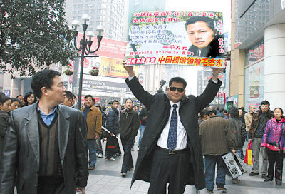 昨天下午4時許,記者在解放碑步行街看到,該男子舉著一塊長1米,寬0.5米的廣告牌在游走,衣著及外形模仿周潤發(fā)在電影《英雄本色》中扮演的“小馬哥”。牌子上大致內(nèi)容是:“中國搖滾領(lǐng)袖舉辦搖滾音樂會,如果你想成名,請收購中國搖滾領(lǐng)袖頭銜,一千萬”。他以這身行頭出現(xiàn)引來上百人圍觀,甚至有市民以為在拍電影,上前與他握手!八褪巧洗握髑f富婆的那個人。”部分市民認出了這名男子正是幾個月前曾在解放碑征千萬富婆結(jié)婚的“征婚狂人”廣西人毛杰東。毛先生表示,想憑自己酷似發(fā)哥的外形,通過征婚獲得資金發(fā)展搖滾事業(yè),雖沒成功,但他熱愛搖滾的熱情還未減退,這次想在解放碑拍賣自己“搖滾領(lǐng)袖”的頭銜,也就是拍賣自己。如果有人愿意拿出1000萬或500萬來投資,他就可以組辦搖滾演唱會,并將繼續(xù)曾經(jīng)的征婚路線,到各大城市宣傳自己,下一站將到成都。下午6時許,經(jīng)保安人員多次勸解、警告,毛杰東才離開步行街。