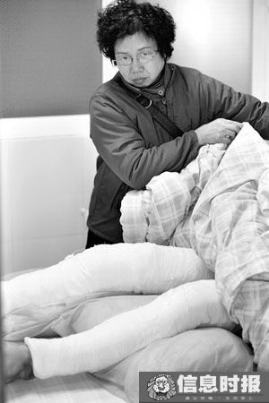 昨日上午,記者前往廣州市紅十字會醫(yī)院看望受傷的蕭河。今年53歲的蕭河躺在病床上,頭發(fā)花白,戴著黑框眼鏡,精神欠佳。