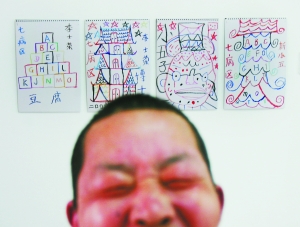 昨日,南京祖堂山精神病院八病區(qū),58歲的建筑工人張兵(化名)笑著在和張貼在藝術(shù)病房墻壁上的自己的畫作合影。當(dāng)天,江蘇省福利彩票發(fā)行中心捐贈5萬元現(xiàn)金和7000元畫室用具,與南京祖堂山精神病院共同建立起全國第一個(gè)精神病院內(nèi)的藝術(shù)病房,激勵(lì)有繪畫創(chuàng)作潛質(zhì)的病人創(chuàng)作原生態(tài)的癲狂藝術(shù)之作。(本報(bào)記者 王申 魏銘言 攝影報(bào)道)