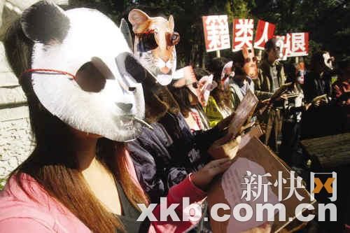 多名自發(fā)組織的志愿者頭戴面具,用行為藝術(shù)呼吁保護動物。許都/攝
