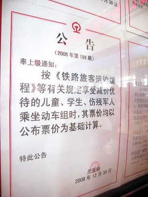 昨天下午,記者來到北京站售票大廳,在大廳的公告欄上看到,一張編號為“2008年第189期”的公告上稱,奉上級通知,按《鐵路旅客運(yùn)輸規(guī)程》等有關(guān)規(guī)定享受減價(jià)優(yōu)待的兒童、學(xué)生、傷殘軍人乘坐動車組時(shí),其票價(jià)均以公布票價(jià)為基礎(chǔ)計(jì)算。