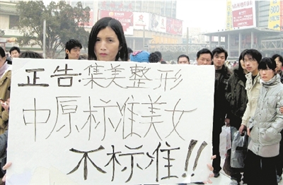 “人為地給美女定下標(biāo)準(zhǔn),是對中原女性的不尊重!弊蛉障挛纾咚,一名身材高挑、披肩長發(fā)、顴骨高凸、細(xì)看還有喉結(jié)貌似女人的男子舉著一塊牌子,牌子上寫著:正告集美整形,中原標(biāo)準(zhǔn)美女不標(biāo)準(zhǔn)!這名男子不時用雙手將牌子舉過頭頂,引得周圍的人們指指點點。