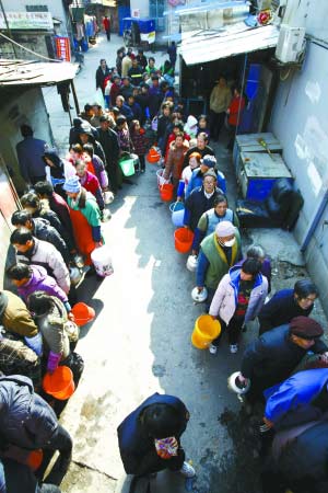 目前,松江當(dāng)?shù)鼐用袂榫w比較平穩(wěn),有序地在送水車或消防龍頭前排隊(duì)等候取水。