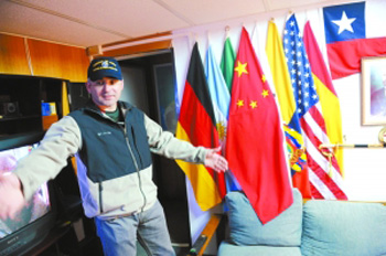 一個星期前,新年冷餐招待會的請諫就送到各國科考站。當(dāng)?shù)貢r間25日下午四時,智利、俄羅斯、烏拉圭等6個科考站的30多人來到了長城站的生活棟。愛吃中餐的智利海軍少校、站長Freldes radio都早早趕來參加新年大餐,這些客人還帶來了紅酒等禮物。