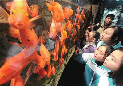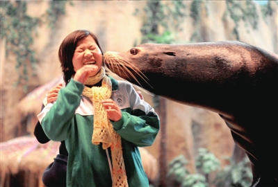 昨天,36名來(lái)自四川青川地震災(zāi)區(qū)的初三學(xué)生來(lái)到北京海洋館,與海獅、海豚近距離接觸。