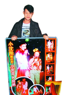 每天晚上8時(shí)11分,小沈龍都會(huì)和同伴們在金萍萍二人轉(zhuǎn)劇場開演。這幾天因?yàn)檫^年的緣故,小沈龍他們通常會(huì)表演到晚上11時(shí)。因?yàn)樾∩蜿柣鸨木壒剩诮鹌计级宿D(zhuǎn)劇場買票的時(shí)候,工作人員都會(huì)提醒:“我們這里有一個(gè)小沈龍,和小沈陽一樣一樣的!痹谝粡埡(bào)上則印著“小沈陽模仿秀——小沈龍”。