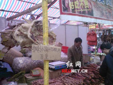 10日上午,網(wǎng)友“湘水悠悠”在紅網(wǎng)論壇發(fā)帖,稱在網(wǎng)上看到一個頗有調(diào)侃味的照片帖,標題為《常德驚現(xiàn)最血腥警示牌》,帖子附帶一個疑似農(nóng)貿(mào)市場上商鋪的照片,在貨臺旁的柱子上掛著一個雷人警示牌“抓到小偷一刀砍死,自重”,還有紅網(wǎng)常德網(wǎng)友爆料稱在“年貨展銷會上親眼看見過”。