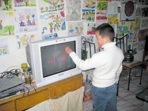 記者日前一進(jìn)小信信家,就被客廳四周貼滿了的畫(huà)吸引住了:有飄著鮮艷的五星紅旗的遠(yuǎn)洋艦;有活潑可愛(ài)的兩只大熊貓;有遨游在大海的快樂(lè)魚(yú)兒。一臺(tái)電視機(jī)正在播放股市行情的節(jié)目,小信信則聚精會(huì)神地觀看著,并很專(zhuān)業(yè)地向記者講解與分析(見(jiàn)圖)。