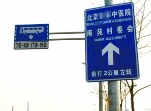看到新聞爆出立水橋附近的“山寨路標”,家住新發(fā)地的時先生發(fā)現(xiàn),自家附近也有這樣“雷人”的指路牌,分別指向附近的兩家醫(yī)院和南苑村委會。