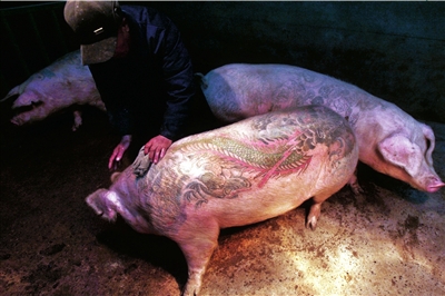 記者看到,還有9頭文身豬在寬敞明亮的豬圈中,而原來一起長大的3個同伴都準備前往歐洲,并被賣出了70萬到100萬元人民幣的高價。9頭豬都是母豬,剛滿周歲。“因為母豬更耐痛,文身更方便!憋曫B(yǎng)員潘師傅說。見到生人進到豬圈,豬開始不安分地嗷嗷叫。這幾頭豬的體重都在400斤以上,長得極為肥碩。它們身上都文有精美的圖案。“這頭文著龍紋標志的豬就叫大龍,文著美人魚的就叫美人魚,它們的名字都是根據(jù)花紋取名的!逼渌i身上文著宗教畫、中國年畫和卡通圖。