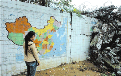 “真沒有想到,斷壁殘?jiān)谋贝ㄖ袑W(xué)廢墟內(nèi),竟然還有這么大一塊完好的圖像……”昨日上午,網(wǎng)友羅先生報(bào)料稱,他和朋友在北川中學(xué)廢墟祭奠時(shí)發(fā)現(xiàn)了一幅完整的中國(guó)地圖,而周圍墻面都遭到了重創(chuàng),堪稱奇跡。