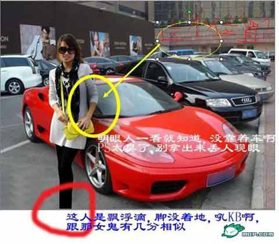 疑點二:從照片中女子與法拉利之間的距離,以及人與車的大小比例看,照片有明顯的PS痕跡。女子的腳甚至沒有拍進照片內(nèi)法拉利旁的地面上,這從整個照片的拍攝角度來看,是不可能的。