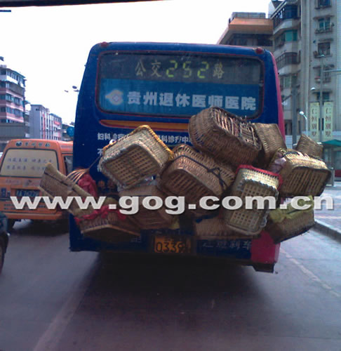 近日,有網(wǎng)友在貴陽論壇上稱,252路公交車是“貴陽最牛公交車”,因車頭車尾都掛著籮筐。