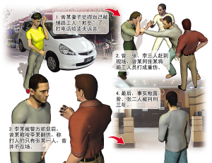 檢察官劉毅稱,當(dāng)時李某是開車去的,被圍觀群眾記下了車牌號,警方據(jù)此將他抓獲。曾、張二人得知李某被抓,商量由張某獨自扛下此事,并統(tǒng)一口徑“曾某不在打人現(xiàn)場,只有張一人動了手!