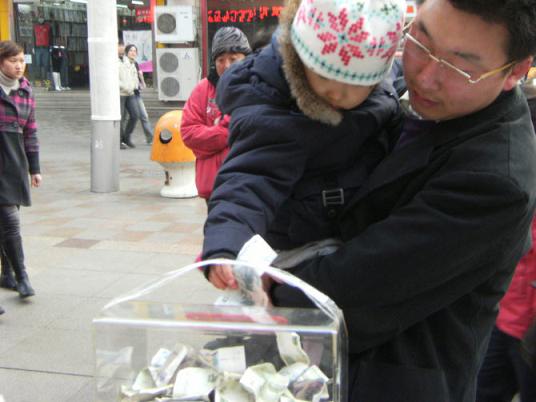 “我和我的好姐妹王靜一起,在青島市區(qū)準(zhǔn)備組織這次捐款活動(dòng)。”劉冰心說,“開始的時(shí)候由于城管管理的比較嚴(yán)格,所以只能通過市北區(qū)紅十字會(huì)協(xié)調(diào),最后允許我們的捐款活動(dòng)可以組織兩天!