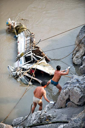 除搜救外,打撈事故車輛殘骸是昨日的重點工作之一。記者了解到,前日上午,當(dāng)?shù)卣M織了80余人趕到事故現(xiàn)場,請當(dāng)?shù)卮ふ业绞鹿受囕v的位置,用繩索固定,用吊葫蘆拉,但因貨車被大石卡住,只好聯(lián)系一輛25噸的吊車來打撈。