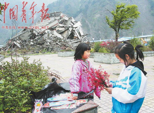 這里是映秀鎮(zhèn)“5·12特大地震”遇難者公墓,安放著數(shù)千名地震遇難者的遺體,清明前的這個(gè)周末,不少遇難者家屬紛紛前來(lái)祭掃親人。山下,賣香燭紙錢(qián)的攤點(diǎn)上放著的一張張地震照片讓不少人暫時(shí)停下腳步。有的照片還被做成書(shū)簽,旁邊配上自己填的詞:“憶秦娥,5·12震中,二00八年五月。西風(fēng)烈,震龍沖出火五月;鹞逶,映秀顫抖!廢墟聲裂......”從城里趕回來(lái)“看”父親的彭瑞,正在仔細(xì)地端詳著照片!鞍职志褪窃谶@里遇難的!彼钢掌系膹U墟說(shuō)。地震時(shí),他在附近的漩口中學(xué)上高三,如今他已是成都一所大學(xué)的大學(xué)生。除了照片,攤點(diǎn)上還放著關(guān)于地震的CD光碟。守?cái)偟男」媚锝榻B,這些都是從鎮(zhèn)里的集市上批發(fā)來(lái)的,光碟里主要是當(dāng)?shù)仉娨暸_(tái)播放的地震后搶救學(xué)生的報(bào)道!坝行┩尥匏赖煤脩K啊,連我爸爸看后都哭了。”她說(shuō)。