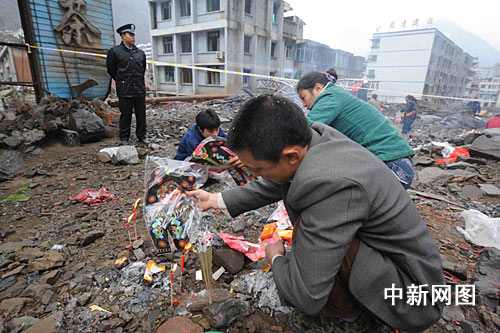 這是大地震后第一個(gè)傳統(tǒng)清明節(jié),老縣城廢墟外的封閉鐵絲網(wǎng)清晨七時(shí)準(zhǔn)默默打開,特意為此地幸存的父老鄉(xiāng)親們開放。綿綿人流回到已成廢墟的千家萬(wàn)戶和學(xué)校機(jī)關(guān)等地前,焚香燃燭,捧上鮮花。只聽遍地哭聲四起,人人都向遇難親人傾吐衷腸。