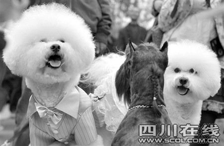 “當(dāng)時(shí)在網(wǎng)上比熊俱樂(lè)部上面認(rèn)識(shí)的!睋(jù)新郎幺幺的主人馮悅悅介紹,一般喜歡養(yǎng)狗的人都會(huì)有一個(gè)交流群,平時(shí)大家有什么經(jīng)驗(yàn)或者需要配種之類就可以網(wǎng)上聯(lián)系。3月下旬,群里舉辦了活動(dòng),要選最美的狗狗配對(duì)拍婚紗照。“幺幺和可可一傳照片,就同時(shí)被選上了!瘪T悅悅說(shuō),剛巧新娘可可的主人于瀾瀾也正想給2歲的可可找個(gè)伴兒,大家一拍即合,舉行了這場(chǎng)婚禮。