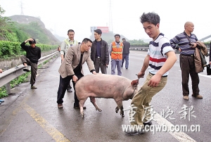 2008年2月26日,渝黔高速路金竹崗隧道,5肥豬“跳車(chē)”攔路,一輛奧迪將2頭豬撞死,隧道交通中斷1小時(shí)。