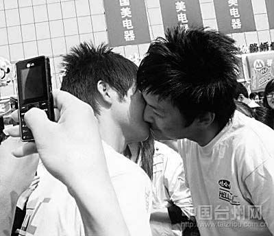 網(wǎng)友Luochen725發(fā)貼:前天下午,我剛好在路橋富仕廣場附近逛街,聽說有接吻大賽,就過去湊熱鬧。不看不知道,一看不得了,兩個男人在接吻,汗,有兩對,頓時被雷倒了!他們還按主持人的要求擺不同的姿勢,熱吻了一個多小時,我暈。∏閭H參加活動可以接受,不過對我來說,這么多人看著,覺得比較怪。而兩個大男人這么大庭廣眾之下接吻,我就真的是無語了。