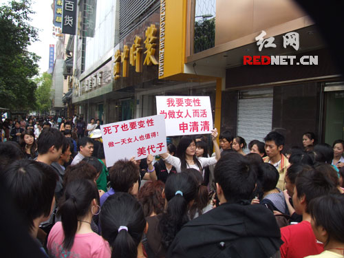 今日(4月13日)下午13時左右,記者收到網友線索,長沙黃興路步行街有兩個怪人舉著“我要變性”的標牌,圍觀的市民把路口堵個水泄不通。記者隨后趕到,發(fā)現其中一人正是前段時間頻頻曝光的“準”變性人申清清,另一個“怪人”則自稱“美代子”。