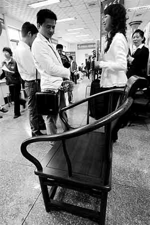 昨日,在武昌起點(diǎn)人力資源市場(chǎng)舉辦的湖南商會(huì)專(zhuān)場(chǎng)招聘會(huì)上,一招聘單位將一把新椅子放在招聘展位前,寓意虛位以待、求賢若渴,期待能招到更多的實(shí)用人才。(記者 金思柳 通訊員 孫文茹 攝)(記者 齊翔 實(shí)習(xí)生 孫廣茹 周琴)