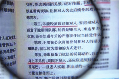 據(jù)悉,2006年,海淀城管分隊(duì)副隊(duì)長(zhǎng)李志強(qiáng)執(zhí)法時(shí)被小販崔英杰刺死后,北京城管對(duì)隊(duì)員進(jìn)行了如何防止暴力抗法的培訓(xùn)。在一次針對(duì)科級(jí)以上(含副科級(jí))人員的培訓(xùn)班上,曾使用過這本教材。但很快有城管隊(duì)員發(fā)現(xiàn)教材的用詞有問題,并對(duì)此提出了質(zhì)疑。此后,這本教材就再未使用過。