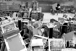 昨天上午,黃龍?bào)w育中心的西門口,3000多臺(tái)賭博游戲機(jī)堆積在此,很快,這些賭博機(jī)被鏟車砸得支離破碎,送上了垃圾車。