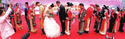 27歲的姜勇和倪爽都是羌族,他們是所有新人中年齡最小的,也是惟一一對均為初婚的新人。昨天,兩人身著民族盛裝,成了焦點中的焦點。眾多攝影記者的長槍短炮不時將兩人團團圍住,“親一個”、“抱一抱”、“背一背”的喊聲一浪接一浪,兩人只好紅著臉一一“示范”。
