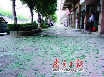 昨日,記者再次來到事發(fā)地看到,警方仍未解除警戒線,幾名民警在現(xiàn)場緊張勘察。事發(fā)街道兩旁的玻璃碎片仍是灑落一地,離爆炸核心位置20多米遠的一家修理店老板介紹,很多玻璃碎片都是從對面街道飛過來的,他指著一塊插入卷閘門的石頭說:“這個也是從對面飛過來的,當時爆炸的威力太可怕了。”