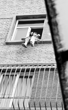 “有人要跳樓啦!”昨日下午3時20分,接到熱線反映,記者趕到了冰窖巷10號省財政廳家屬院,此時門口已經(jīng)聚集了不少圍觀的群眾。在緊鄰家屬院門口的一棟家屬樓上,記者看到,一位穿著淺色衣服的女子坐在四樓的窗臺上,頭發(fā)散亂,兩腿朝外懸在半空,懷里還抱著一個小孩。六七名民警一邊維持秩序,一邊通過喊話勸說該女子離開窗臺,一輛“120”救護車也在一旁待命,省財政廳的十幾名保安人員一直守在樓下,隨后又拿來被褥張開,以防該女子和孩子出現(xiàn)危險。