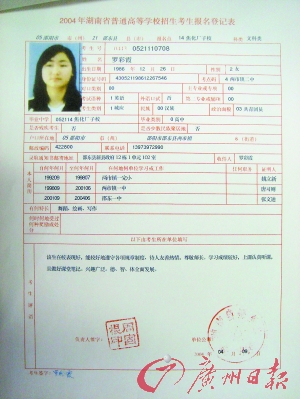記者昨日查閱假羅彩霞當(dāng)年被錄取的紙質(zhì)檔案。這份編號(hào)為“520821102”的《湖南省2004年普通高等學(xué)校錄取新生名冊》上,“羅彩霞”的考生號(hào)為“04430521110708”,批次為“第二批”,錄取形式為:“計(jì)劃:國家任務(wù)定向”,上面還有羅彩霞的身份證號(hào)等考生基本信息。這份新生名冊的左下方加蓋了“湖南省普通高校招生委員會(huì)錄取專用章”的大紅印章。黃開烈說:“我們不能隨便懷疑這個(gè)考生是假的。我們每年招6000多名學(xué)生,每個(gè)都去懷疑是不可能的。造成假羅彩霞事件的本質(zhì)問題和根源問題不在貴州師大。他們造假能做到這一步,也是我們無法想象的!(文/圖 特派貴陽記者文遠(yuǎn)竹)