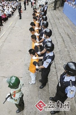 昨天下午1點30分,公判大會在富民縣鬧市區(qū)富民電影院門口準時召開,露天會場戒備森嚴,會場拉起警戒線,會場內外、周圍街道上站滿執(zhí)勤民警,9名頭戴鋼盔荷槍實彈的民警、武警分別站在會場內維持秩序。