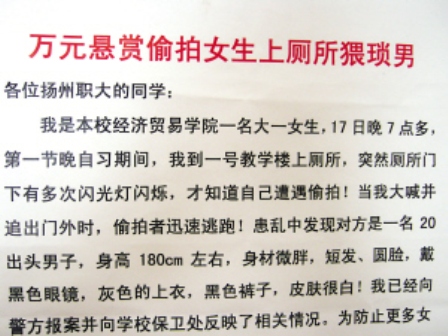 18日,一張張名為《萬元懸賞偷拍女生上廁所的猥瑣男》的“懸賞啟事”,張貼在了揚州職業(yè)大學(xué)校園內(nèi),吸引了該校師生的注意。記者看到,“懸賞啟事”標(biāo)題的字體和顏色都格外醒目,內(nèi)容為一位大一女生遭遇偷拍的經(jīng)歷!拔沂潜拘=(jīng)濟(jì)貿(mào)易學(xué)院一名大一女生,17日晚7點多,第一節(jié)晚自習(xí)期間,我到一號教學(xué)樓上廁所,突然廁所門下有多次閃光燈閃爍,才知道自己遭遇偷拍!……我已經(jīng)向警方報案并向?qū)W校保衛(wèi)處反映了相關(guān)情況。為防止更多女生受侵害,早日將這種性變態(tài)的人繩之以法,我個人出10000元懸賞知情人提供有價值線索。”記者注意到,“10000元”的字體很大,而且是紅顏色,格外惹眼。啟事最后還寫著“捍衛(wèi)女生權(quán)益,和偷拍斗爭到底”的字樣。