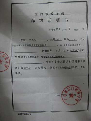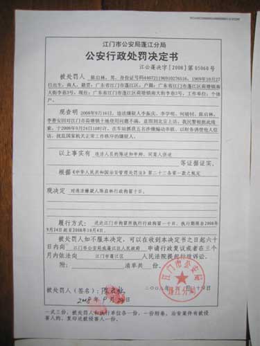 但是,對于江門日報刊登的報道,一名網友給本網提供了《行政處罰決定書》的圖片,在該圖片上可以清楚地看到,決定書上寫著“現(xiàn)查明2008年9月16日,違法嫌疑人……因對江門市荷塘鎮(zhèn)土地使用問題不滿,意圖到北京上訪。我民警根據此線索,于2008年9月24日10時許,在車站抓獲五名涉嫌煽動串聯(lián)、以財務誘使他人信訪,擾亂國家機關正常工作秩序的嫌疑人”,在決定書下方有被處罰人簽名和指模,以及江門市公安局蓬江分局蓋印。該名網友同時提出質疑,聲明摘錄如下: