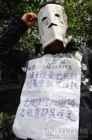 昨(18)日,一自稱上當(dāng)受騙后荷包干癟、欲掙“快”錢贖回典當(dāng)物的男子,掛著一塊“背部出租”的牌子出現(xiàn)在鬧市區(qū)!坝衷谧魇裁葱?”該男子的出現(xiàn),引來不少市民圍觀議論。曾幕后策劃了“公開招丫頭和夫人”、“最美丑女征婚”的、號稱“資深策劃人”的仁壽縣人王江與提供此線索的報料人也同時出現(xiàn)在現(xiàn)場,不禁讓人懷疑這是王江的又一次炒作。