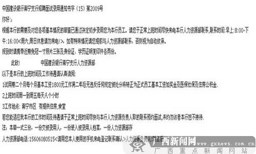 即將畢業(yè)的大學(xué)生如果收到一份來自“中國建設(shè)銀行南寧支行”的面試通知書,上面約定“試用期二個月,每個月基本工資1800元。工作滿二年后,無違反任何規(guī)定被處分將轉(zhuǎn)正為正式員工,基本工資加獎金、醫(yī)保、社保、住房公積金……”等你給對方打電話過去時,對方要求你體檢后再去面試,那你就得多長個心眼,這極有可能是騙局。