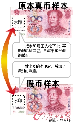 犯罪嫌疑人采用挖補(bǔ)方式,將真幣的水印挖出來(lái)后,用膠水粘貼到假幣當(dāng)中,原來(lái)的真幣則填充上假的水印,填充上假水印的真幣也成了假幣,“這樣100元就變成了200元,嫌疑人造出假幣后就馬上到柜員機(jī)存入假幣,再到另一個(gè)柜員機(jī)取出真幣,繼續(xù)偽造!