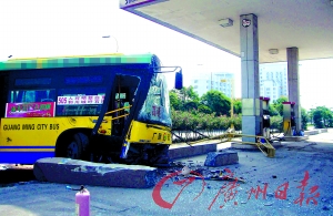 記者接報趕至時看到,一輛公交車斜跨在加油站水泥地上,車頭玻璃裂成網(wǎng)狀,前車門傾斜,地面到處是玻璃片,粗大的水泥護欄也被撞斷成兩截,“摔”在車頭前。距離車頭一米處,是一個折斷的路燈。
