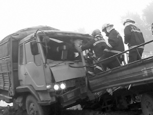 傷者楊女士回憶,她坐在第二排靠近道內(nèi)的一側(cè)。她們的車是從西向東行駛,那輛解放車自東向西迎面開來。原本在對向行駛車道上的解放車為了超其前面的小貨車,一下子沖上她們這輛車行駛的車行道上。因為霧氣太大,躲閃不及,解放貨車與農(nóng)用三輪車猛地撞在一起,楊某被震出,三輪車摔落在路旁的溝里。