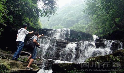 沿著玉屏山頂?shù)穆糜斡^光道前行不久,右側樹林邊出現(xiàn)了一個醒目的標識牌:玉水谷。牌子邊,一條滿是青苔的石板路彎彎曲曲地往山谷深處延伸;步行15分鐘,一條清澈的小溪即映入眼簾,其間綿延的疊瀑群格外迷人,這便是昔日的“磨子溝天體浴場”,現(xiàn)在的“玉水谷”。