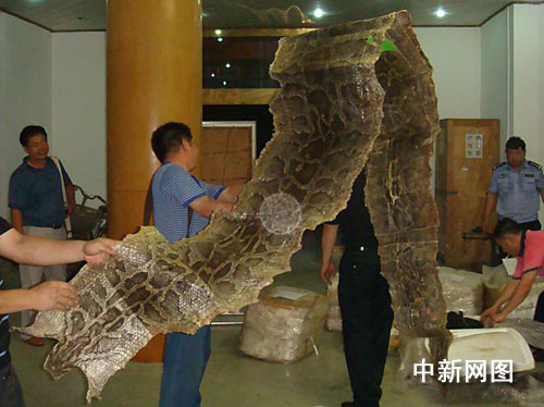 據(jù)防城港市森林公安清點統(tǒng)計,警方截獲的大貨車內(nèi)共有173只熊掌、4張蟒蛇皮和國家二類保護動物穿山甲1只。其中,最長的蟒蛇皮達5米。