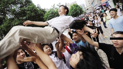 高考最后一門英語(yǔ)結(jié)束了,對(duì)緊繃的高三學(xué)生來(lái)說(shuō),這是一個(gè)歡樂的時(shí)刻,輕松的時(shí)刻。周南中學(xué)十幾名高三學(xué)生,剛走出長(zhǎng)沙一中考點(diǎn),便將班主任吳老師舉起拋向了空中。