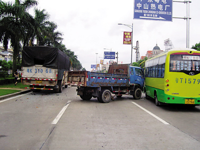 本月3日上午10時(shí),一男子駕駛粵T/H45×9大貨車(chē)在南三公路三角路段由超車(chē)道變主車(chē)道過(guò)程中,被后面同在超車(chē)道行駛的粵K310×8大貨車(chē)撞上了左后角,之后,粵T/H45×9大貨車(chē)失控沖過(guò)主車(chē)道又與在慢車(chē)道行駛的粵T157×4購(gòu)物免費(fèi)接送車(chē)發(fā)生碰撞,事故造成購(gòu)物免費(fèi)接送車(chē)上的一名乘客骨折受傷,三車(chē)受損。