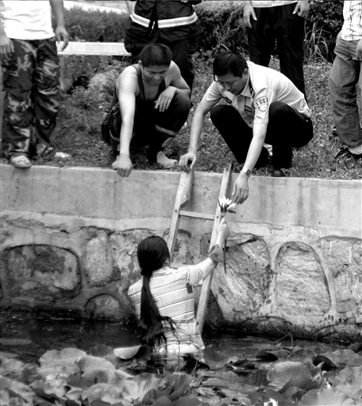女子把放在水里的衣服重新穿上,在消防隊(duì)員的協(xié)助下爬了上來。她在上岸之前,還順便從河中摘了一朵蓮花獻(xiàn)給警察,以示“感謝”(右)。