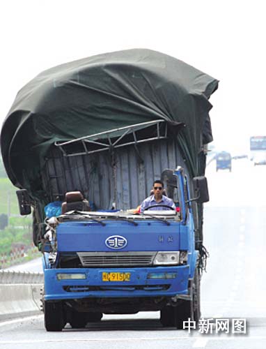 中新網(wǎng)杭州7月27日電(記者 龔讀法 通訊員周銘)在7月25日下午,記者在浙江省杭州市采訪途中發(fā)現(xiàn)非常雷人的一幕:104國道瓶窯段,一輛閩C牌照的大貨車,滿載貨物急速行駛著,但是仔細一看,這輛貨車的駕駛室卻是“敞篷”的。這樣的景象嘆為觀止。