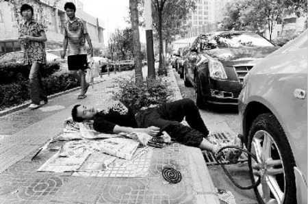 洪作剛說,他擔心即使通過法律途徑對方也不肯還錢。于是,8月13日下午,他買來一把U型大鎖,白天就將車鎖在下水道鐵柵欄上,連著3天晚上,怕自己睡著、老板將車開走,他就將鎖子的另一頭鎖在自己的腳踝上。晚上,他就睡在馬路邊的報紙上,路邊蚊子多,他就在周圍點上四盤蚊香。