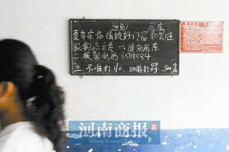 李先生是這棟樓的房東,身后墻壁掛的黑板上,寫著一則通知:“夏季來臨請鎖好門窗,如果誰家物品丟失:一、通知房東;二、報(bào)警電話65718584;三、不準(zhǔn)打110,如誰打罰500元!